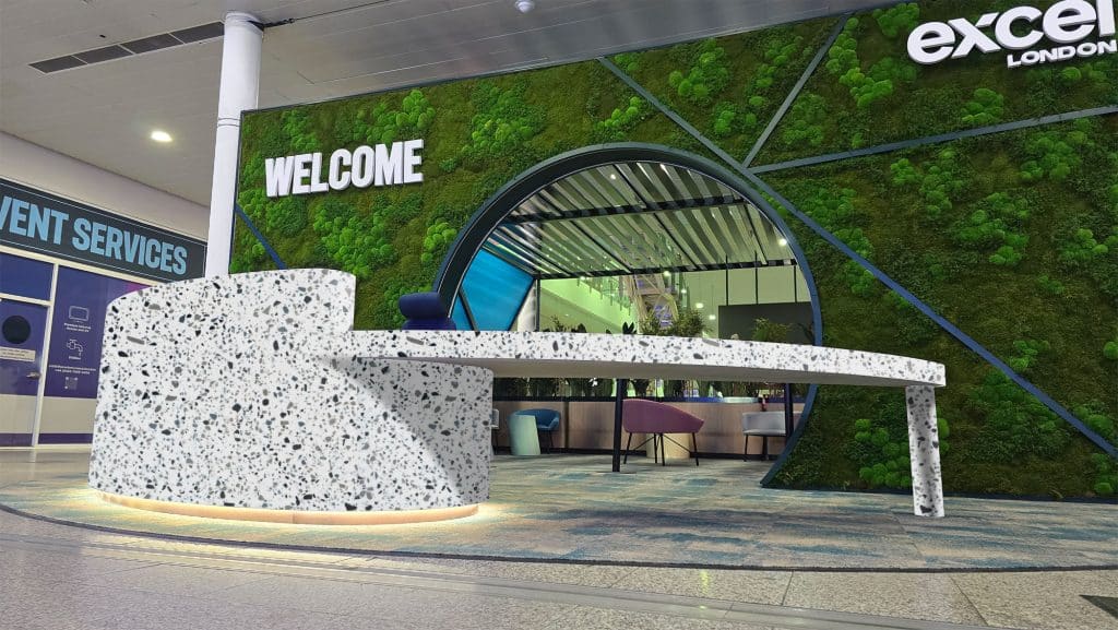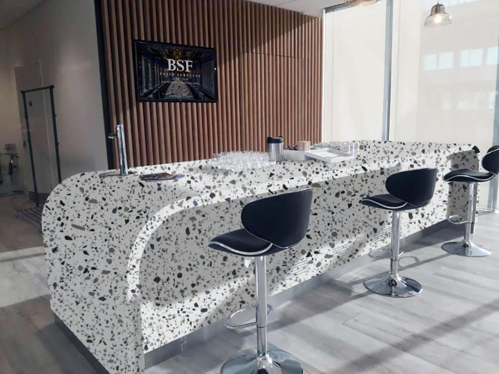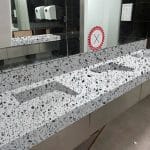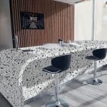 Description: Meganite Alpi Terrazzo features a predominantly white or pale background with scattered chips and fragments in varying neutral tones, creating a classic terrazzo effect reminiscent of traditional Venetian surfaces. The overall impression is elegant and light, with subtle contrasts provided by the embedded flecks.