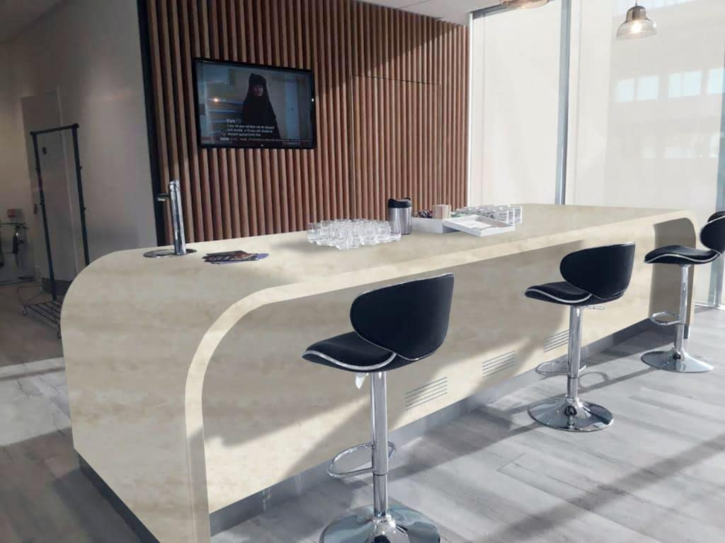 Description: HIMACS Aurora Angora is a stylish colour featuring horizontal veining on a creamy background. Its natural yet modern look is perfect for interiors and retail spaces, offering a blend of classic marble design and contemporary style.