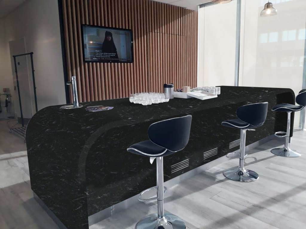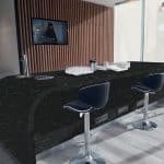 Description: Hanex Cascade Black is a rich black colour with subtle veining and low colour contrast, creating a sophisticated look suitable for various interior designs and popular for countertops and other uses.
