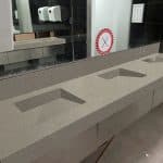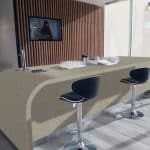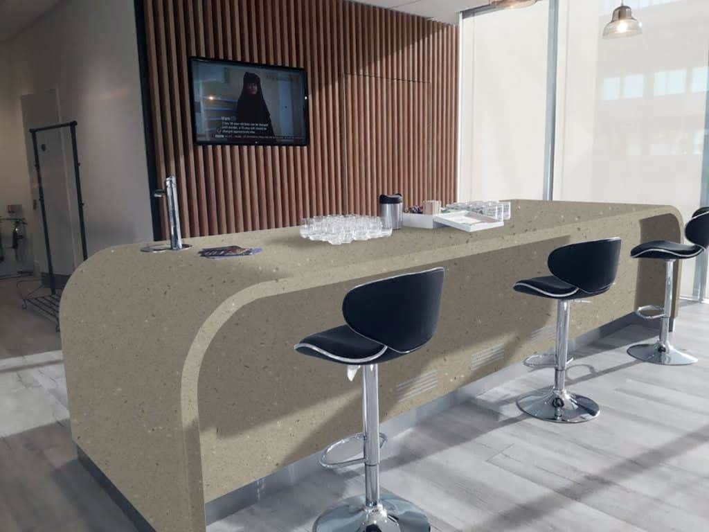 Description: The HIMACS Chic Concrete colour is a flat, cool, urban gray with light and dark flecks, giving it a natural and sophisticated appearance. It's designed to mimic the coarse-grained, 'splattered' look typical of concrete, making it ideal for modern interiors, especially in kitchens and bathrooms.