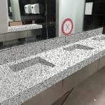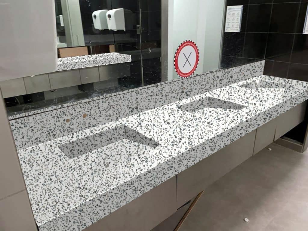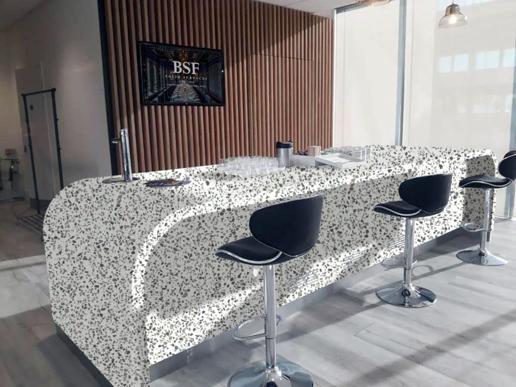 Description: Corian Domino Terrazzo features a light background with scattered grey and black flecks, creating a visually striking pattern inspired by mid-century modern design. The versatile colour palette can complement various design styles, making it an attractive choice for worktops and other applications.