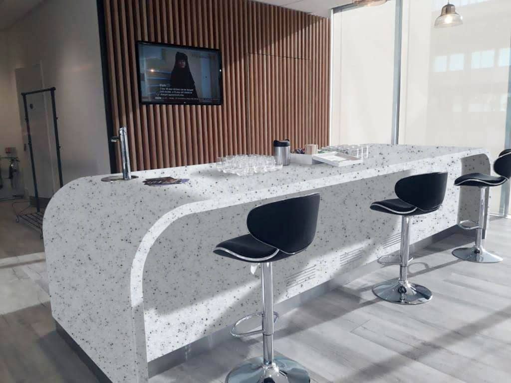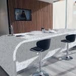 Description: Durasein Duomist features an elegant blend of soft, muted grey tone, with darker grey speckles, creating a misty, subtle, sophisticated effect. It complements various design styles and can serve as a perfect backdrop or statement piece in any interior space.