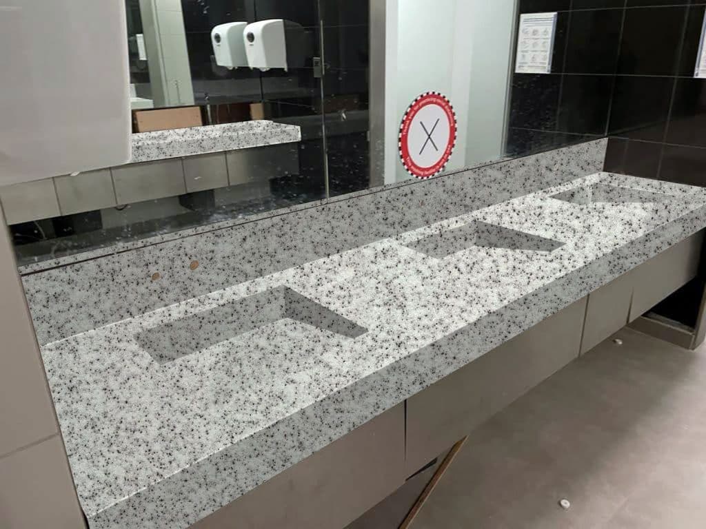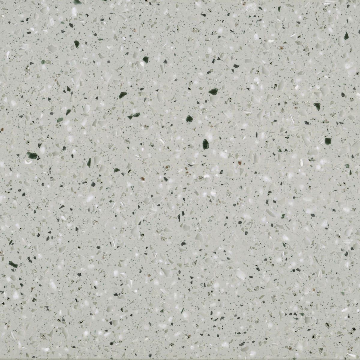 Description: Grey Sand HIMACS features a soft, muted palette with a primary hue of pale grey, complemented by subtle speckles of black and white, creating an elegant, textured surface reminiscent of natural sand, suitable for various design applications.
