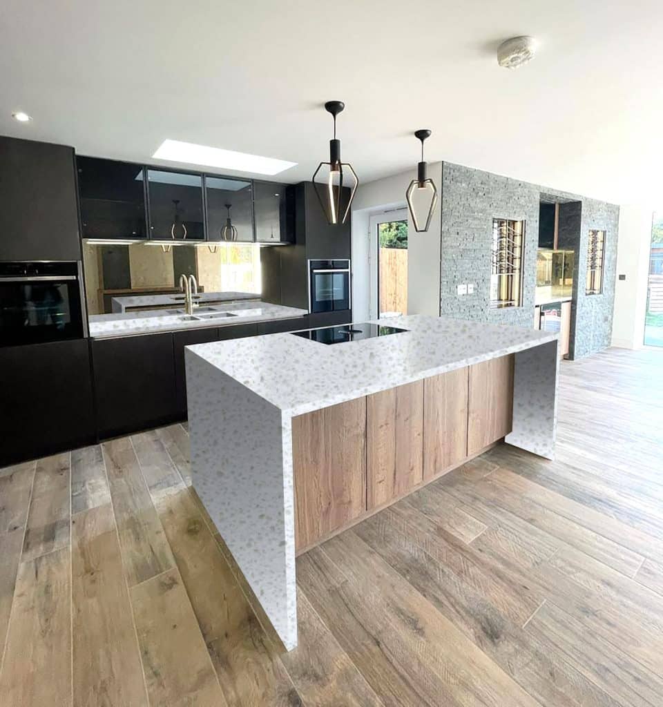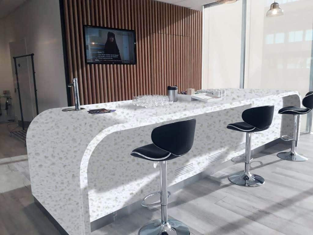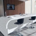 • Description: Hanex Helsinki is shiny white with light grey specks. It reflects light and is suitable for various interior styles.