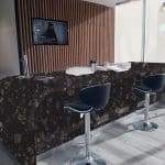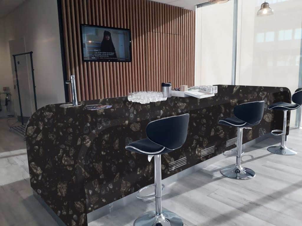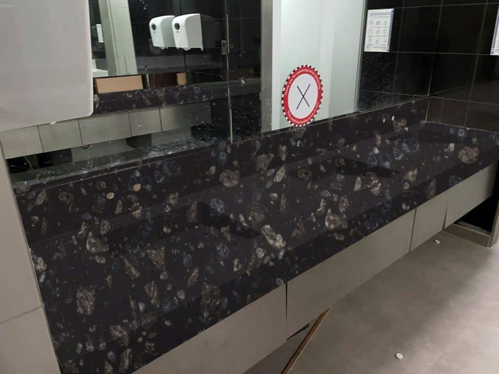 Description: The Staron Quarry Earthen Stratum has a deep, nearly black base colour with variously sized chips, creating a unique texture. The rich, dark background with lighter chips results in a visually striking material reminiscent of polished natural stone, making it an excellent choice for bold and sophisticated designs.