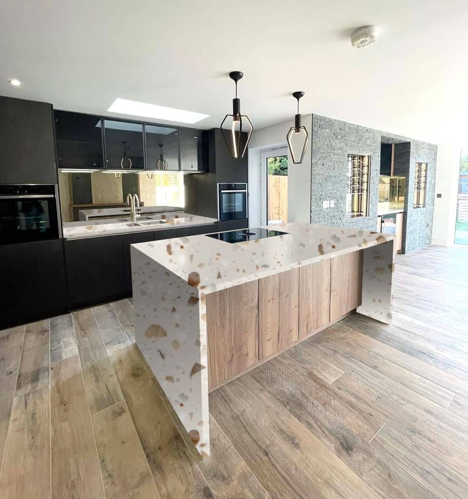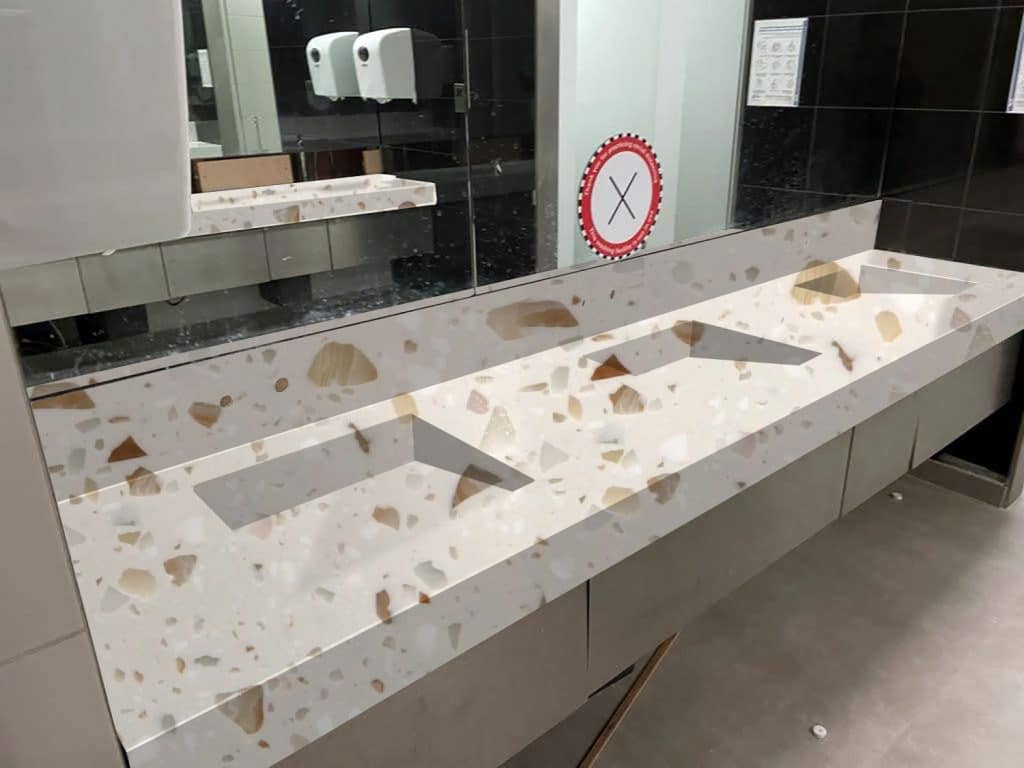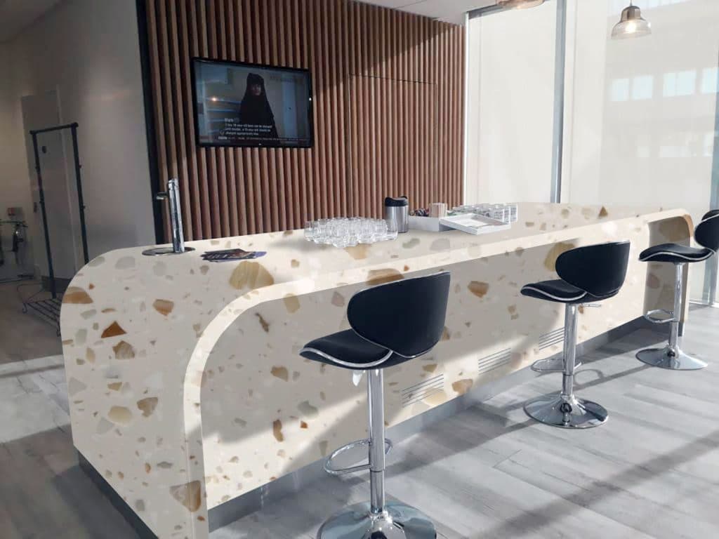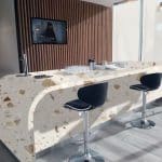 Description: The Staron Terrazzo Bologna has a warm, inviting colour palette predominantly in beige and cream tones, enhanced with speckles for a classic terrazzo look. This creates a sophisticated, versatile surface that complements various design styles with a subtle, elegant appearance.