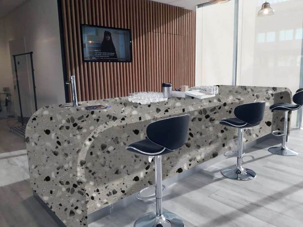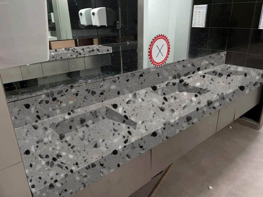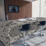 Description: Staron Terrazzo Torino has a refined grey base with black, white, and light brown accents, making it suitable for various design applications. The colour palette enhances its aesthetic appeal and contributes to its durability and easy maintenance.