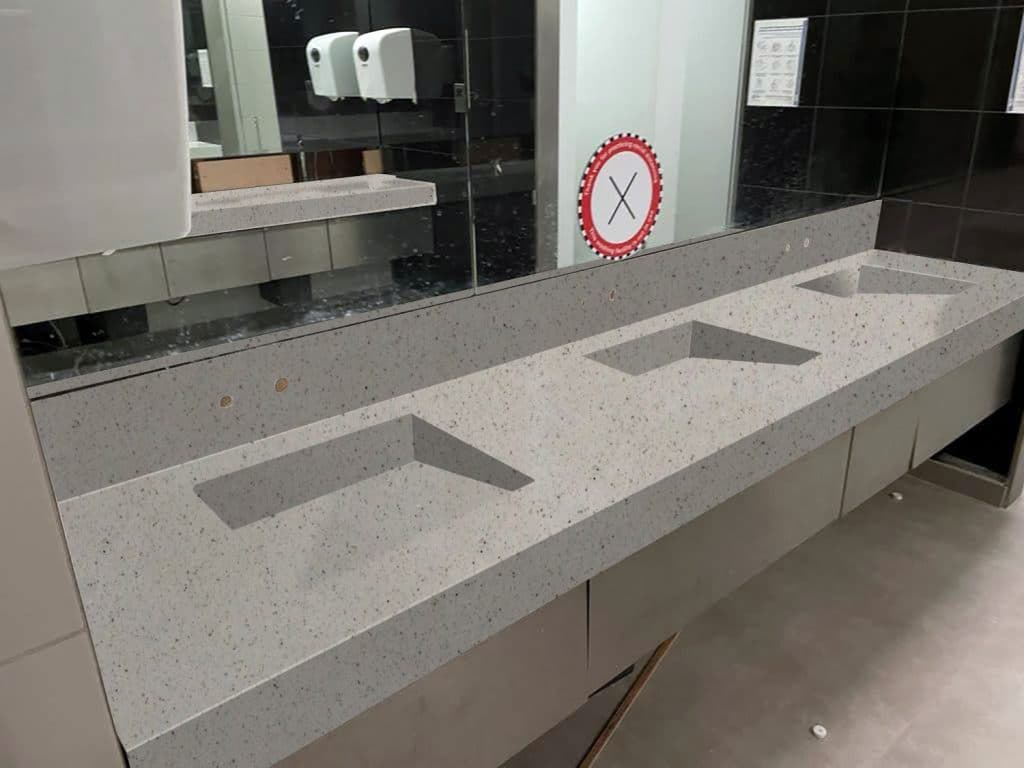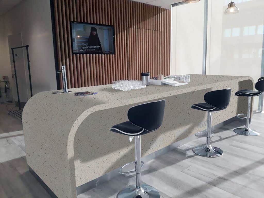 Description: Staron Sanded Goose features warm, neutral shades of beige, cream, and soft grey with a speckled pattern resembling natural granite. It's versatile and suitable for kitchen and bathroom surfaces, complementing both modern and traditional aesthetics.