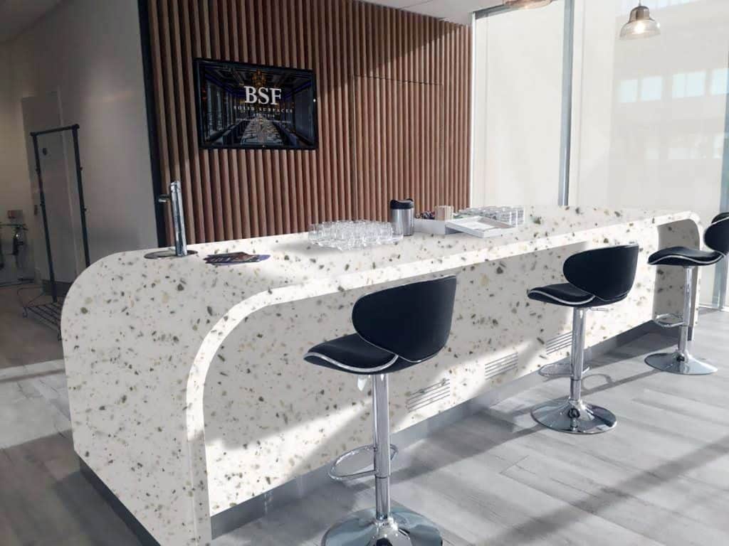 Description: Corian Stonique has a classic white background with warm, subtle translucent particles, giving it an elegant, stone-like appearance. This makes it perfect for adding a touch of luxury to any design.