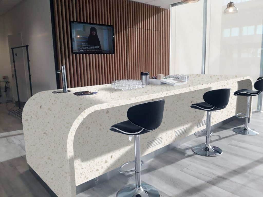 Description: Staron Tempest Bamboo offers a blend of warm cream, beige and soft brown hues reminiscent of bamboo. It has a gentle, textured look with fine specks, making it suitable for modern and classic designs, creating a peaceful and stylish atmosphere. Additionally, it is durable and versatile for a wide range of uses.