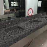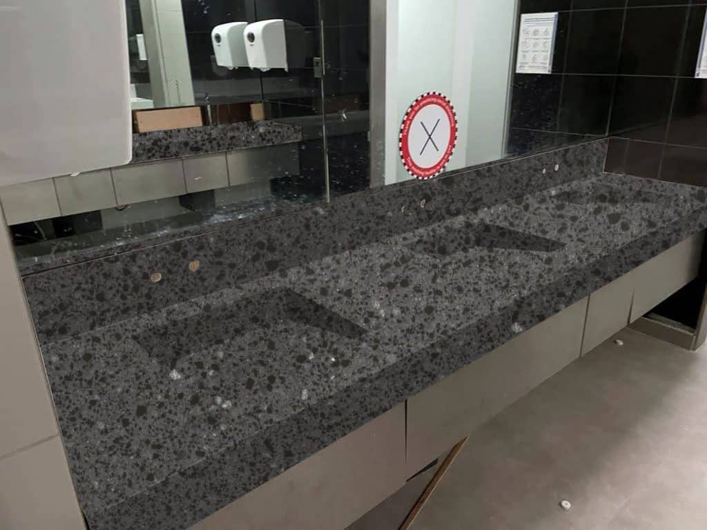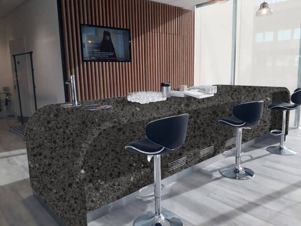 Description: Staron Tempest Caviar features a rich, deep grey hue with metallic flecks and translucent chips, creating a visually dynamic terrazzo effect. This modern and versatile surface adds elegance and sophistication to various design applications