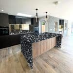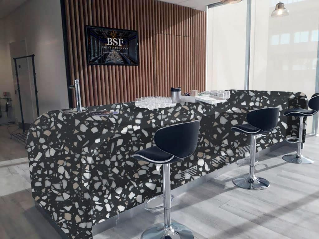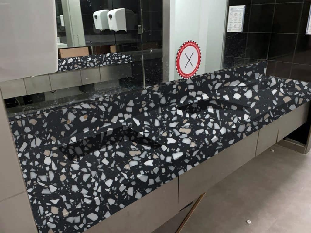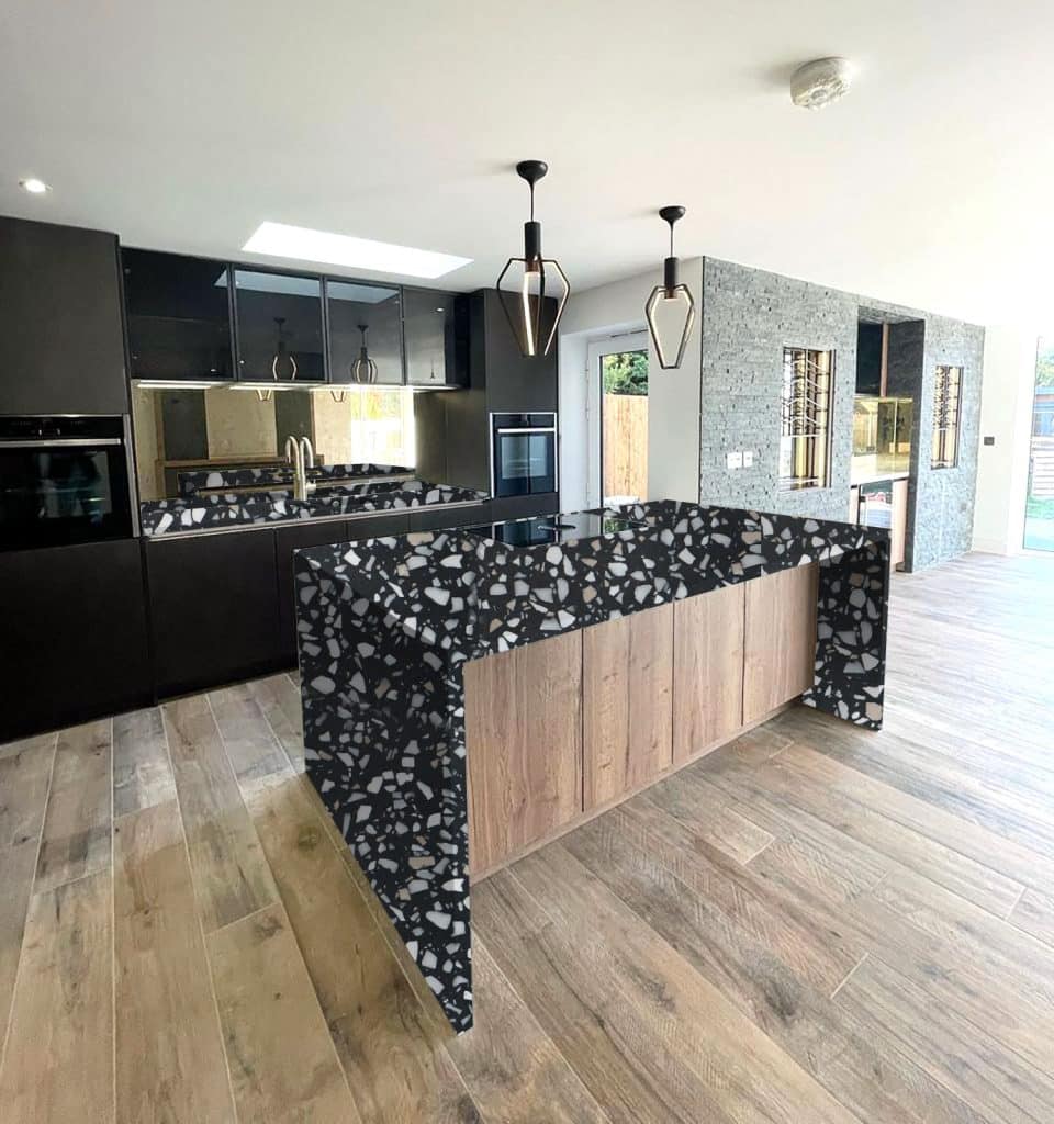 Description: Urban Terrazzo by Meganite features a deep charcoal base with contrasting white and grey fragments, offering a bold and contemporary aesthetic.