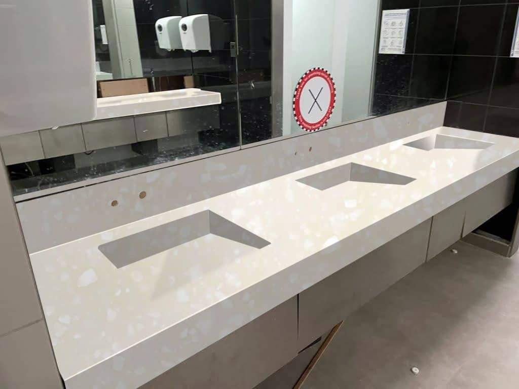 Description: White Crystal Boulder is a soft, neutral cream tone featuring delicate translucent flecks that create a frosted glass appearance. This subtle design adds depth and visual interest, making it ideal for backlit applications where the surface can interact with coloured lighting to produce a gentle glow. Its understated elegance suits a variety of interior settings, offering a refined and versatile aesthetic